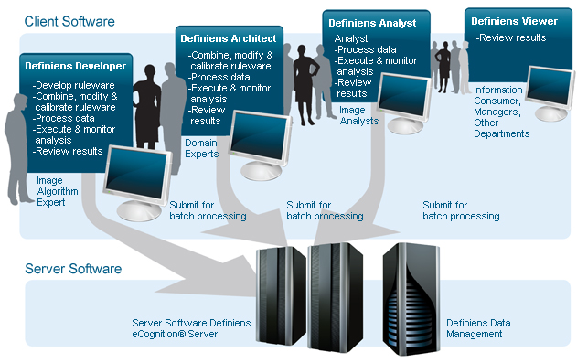 The client software is role-based and supports the needs and skills of different users in an organization. The server software, known as the Definiens eCognition® Server, is a processing environment that allows the batch processing of jobs. It is hugely scaleable, capable of handling millions of images in a single job.
